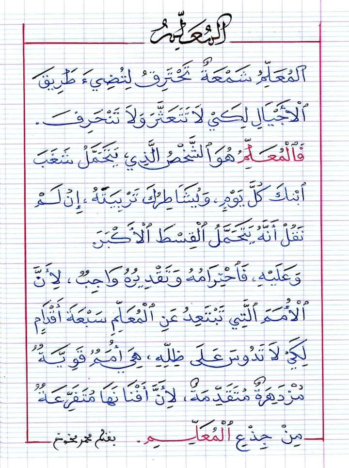ابتعد عن ظل المعلم سبعة أقدام لكي لا تدوس عليه، عن ظل المعلم أتحدث، فما بالك بالمعلم نفسه. لا خير في أمة يُبخسُ فيها المعلم حقه، وهو أساس بناء المجتمع.