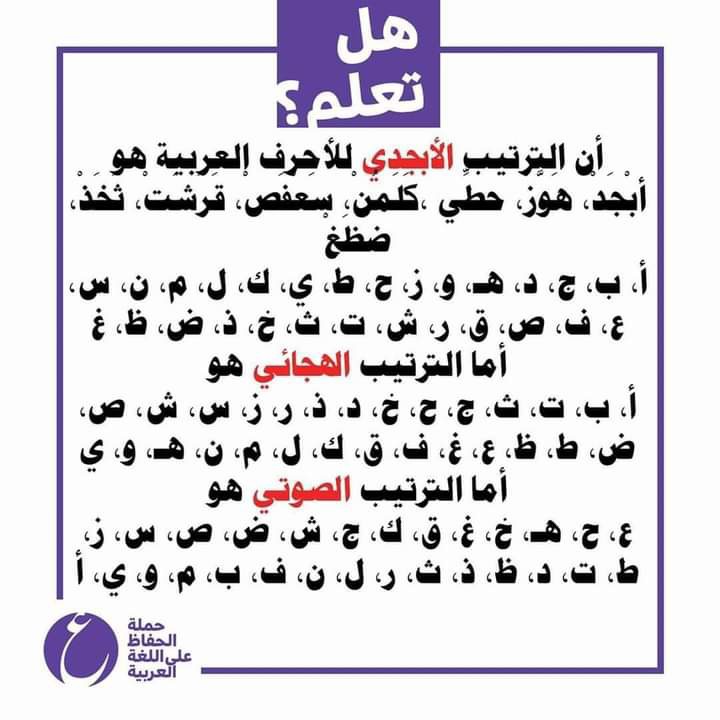 1- #الترتيب_الأبجدي :صنفت هذه الحروف وفق معيار الأصول التاريخية، ففرّعت بحسبه إلى حروف ساميّة (من أصل سامي) وأخرى عربية. أما السّاميّة فعددها اثنان وعشرون (22) حرفا وهي : أ، ب، ج، د، هـ، و، ز، ح، ط، ي، ك، ل، م، ن، س، ع، ف، ص، ق، ر، ش، ت. وأما العربية فهي ستة (6) أحرف أضافها العرب إلى الأصل السامي وانفردوا بها، وتسمى “الروادف” وهي : ث، خ، ذ، ض، ظ، غ. سمي هذا الترتيب “الترتيب الأبجدي”، نسبة إلى الكلمة الأولى من الكلمات التي جمعت فيها هذه الحروف حسب ترتيبها التاريخي (ساميّة فعربية) تيسيرا لحفظها وجريانها على الألسنة، وهذه الكلمات هي : أبْجَدْ، هَوَّزْ، حطِّي ،كَلَمُنْ، سَعْفَصْ، قَرَشَتْ، ثَخَذْ، ضَظَغْ. أما الحروف كاملة فترتيبها التالي : أ، ب، ج، د، هـ، و، ز، ح، ط، ي، ك، ل، م، ن، س، ع، ف، ص، ق، ر، ش، ت، ث، خ، ذ، ض، ظ، غ.