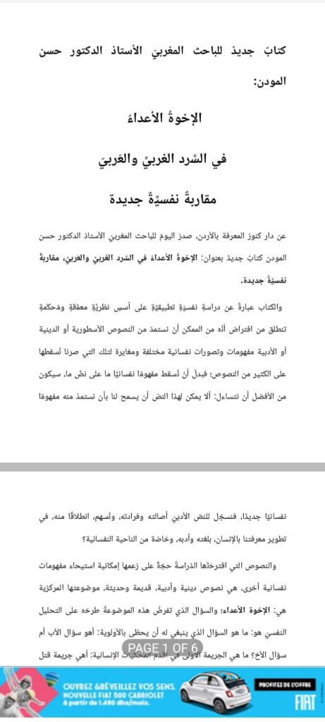 عن دار كنوز المعرفة بالأردن، صدرَ اليومَ للباحث المغربيّ الأستاذ الدكتور حسن المودن كتابٌ جديدٌ بعنوان: الإخوةُ الأعداءُ في السَّرد الغربيِّ والعَربيِّ، مقاربةٌ نفسيَّةٌ جديدة.