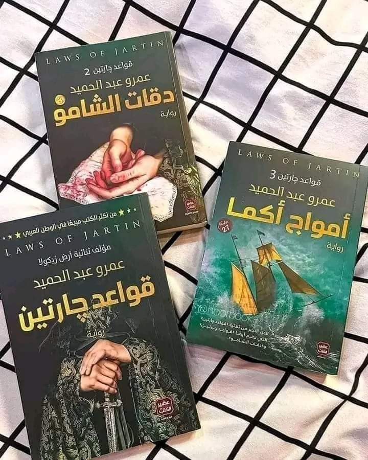 ثلاثية قواعد جارتين/ عمرو عبد الحميد 📚💚📗قواعد جارتينروايه تحمل الكثير من الأدرينالين بين طياتها ، عالم خيالى – جارتين – ملئ بقوانينه العجيبه تفادياً لاخطاء أجدادهم تنصف الشريفيين وتظلم النسالى والغجر .. نفق مظلم عاشوا فيه لاجيال حتى اصبح النفق مظلم بلا نور فى نهايته الا أن هناك قاعده وضعها الكاتب “القوانين وضعت لتُكسر”!📗دقات الشاموفكرة الروايه جيده ، حيث ناقشت القوانين الظالمه في (جارتين) القائمه على العنصريه ، وتبلور القوانين بأيدي واضعيها لخدمة مصالحهم وهذا ما يوجد في العالم الحقيقي أيضاً.📗أمواج أكما الأسلوب والسرد الأكثر من الرائع الذي اعتدناه من الكاتبالذي يمتلك قدر كافي من الخيال جعله لم يفشل قط في إثارة إنبهاري وخيالاتيأن إحداث التغيير يتطلب وفرة من العزيمة والشجاعة و بذل الكثير من الجهد ويتطلب الكثير من التنازلات والخضوع إلى وبعض الخسارة القليلة في سبيل مكسب كبير.