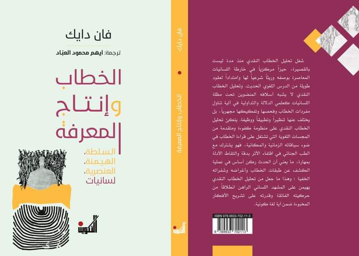 (الخطاب وإنتاج المعرفة) صدر عن دار التكوين في دمشق كتاب (الخطاب وإنتاج المعرفة) لعالم اللسانيات الهولندي فان دايك بترجمة الشاعر والأكاديمي أيهم محمود العباد. تضمن الكتاب، الذي حاز مؤخراً على جائزة بيت الحكمة لأفضل كتاب مترجم للعام ٢٠٢٣، سلسلة من الدراسات المكرسة للتعريف بمنهج التحليل النقدي لمختلف أنواع الخطاب لاسيما السياسية التي غالباً ما تضمر بعداً إيديولوجياً لا يمكن الكشف عنه إلا عبر أدوات تحليل خاصة. ومن مقدمة المترجم نقرأ: “يتكىء تحليل الخطاب النقدي على منظومة كفوءة ومتقدمة من المجسات اللغوية التي تشتغل على قراءة الخطاب في ضوء سياقاته الزمانية والمكانية ، فهو يشترك مع الطب الجنائي في اقتفاء الأثر بدقة، والتقاط الأدلة بمهارة ، ما يعني أن الحدث ركن أساس في عملية الكشف عن طبقات الخطاب وأغراضه وشفراته الخفية ؛ وهذا ما جعل من تحليل الخطاب النقدي يهيمن على المشهد اللساني الراهن انطلاقاً من حركيته الفائقة وقدرته على تشريح الأفكار المخبوءة ضمن أية لغة كونية). يذكر أنَّ الشاعر والأكاديمي أيهم محمود العباد، أصدر عدداً من الأعمال الشعرية، منها : (رقصة على استحياء)، و(قبل أن ينقرض العالم) و(صورة تذكارية في الجنة) كما ترجم إلى العربية كتاب (مقالات ومحاضرات) لأوسكار وايلد و(دراسات في التشاؤم) لآرثر شوبنهاور.