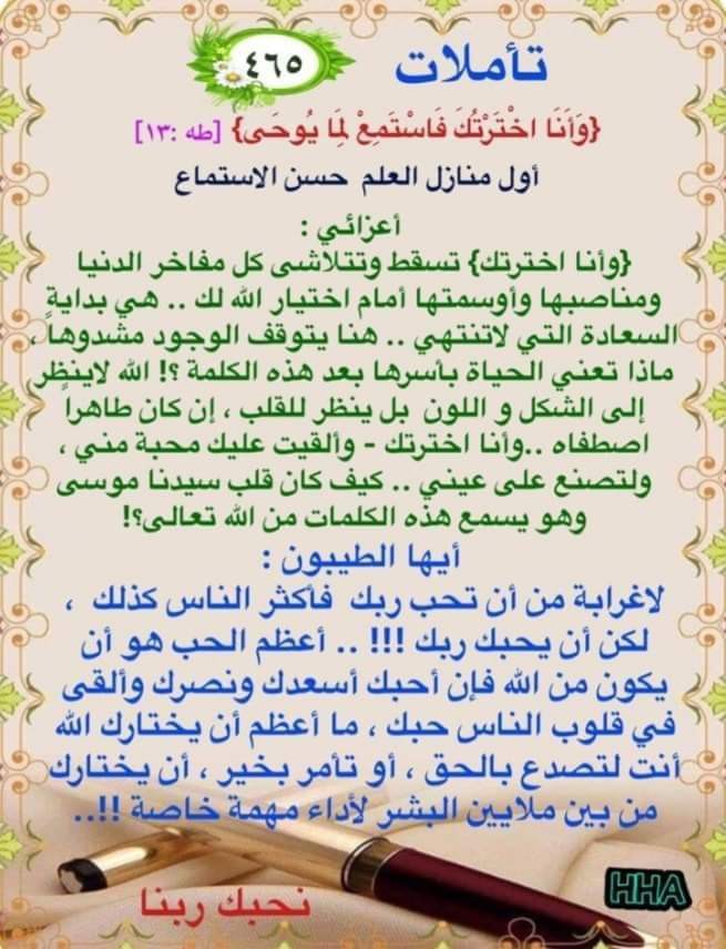 {وأنا اخترتك} تسقط وتتلاشى كل مفاخر الدنيا ومناصبها وأوسمتها أمام اختيار الله لك .. هي بداية السعادة التي لاتنتهي .. هنا يتوقف الوجود مشدوهاً ، ماذا تعني الحياة بأسرها بعد هذه الكلمة ؟! الله لاينظر إلى الشكل و اللون بل ينظر للقلب ، إن كان طاهراً اصطفاه ..