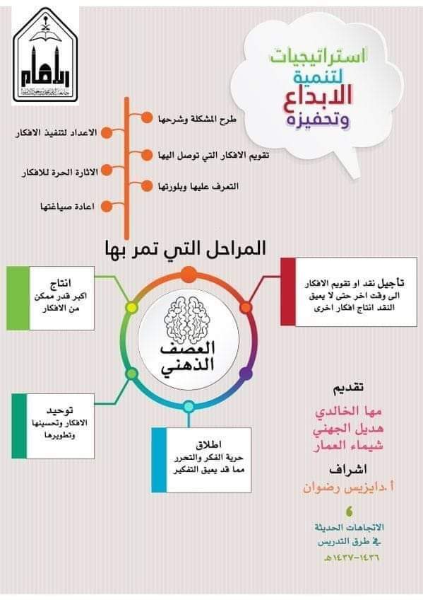 العصف الذهني، يقصد به وضع الذهن في حالة من الإثارة بغرض التفكير في كل الاحتمالات، للوصول إلى أكبر عدد ممكن من الأفكار والآراء حول مشكلة أو موضوع معين. وهذه الإستراتيجية مبدأها التفكير حول السؤال الذي يطرحه المعلم. كما أنها تحث الطالب على الإبداع، وتشجعه على استخراج كل الأفكار التي تطرق ذهنه؛ وعرضها للمعلم؛ من دون خجل أو خوف، كما تهدف هذه الإستراتيجية إلى إمكانية الوصول للحلول المتكاملة بطريقة بسيطة، وفعالة ومبتكرة في نفس الوقت.