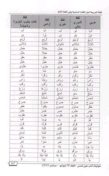 فكل كلمات الجدول أدناه أصلها عربي ولا يوجد شيء يسمى لغات سامية بل هي اللغة العربية أصلا ومعنى